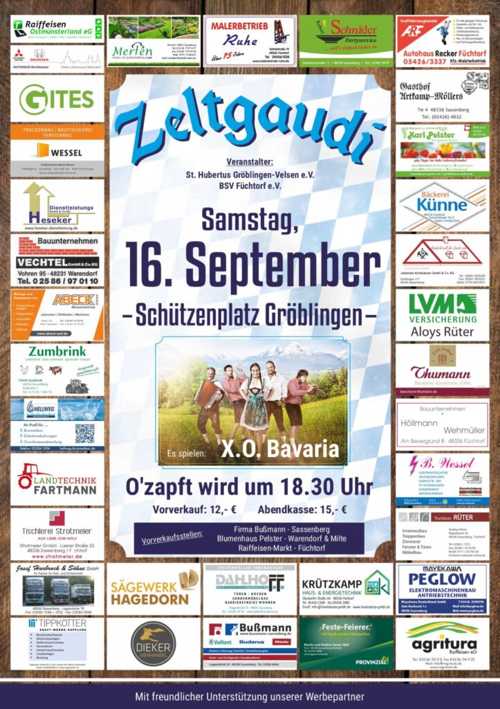 « Alle Veranstaltungen Diese Veranstaltung hat bereits stattgefunden. Zelt-Gaudi in Gröblingen 16. September 2023 « Kreisehrengardentreffen in Füchtorf Volkstrauertag am Ehrenmal in Gröblingen » Zum Kalender hinzufügen Google Kalender iCalendar Outlook 365 Outlook Live Details Datum: 16. September 2023
